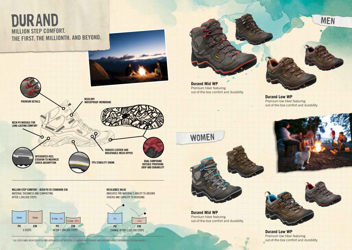 Tej jesieni pojawiła się uniwersalna i odporna na całe trekkingowe wyzwania linia Durand dla osób i mężczyzn. Durand WP Mid i Durand WP Lowcharakteryzują się niezwykłą trwałością zarówno w suchych jak również mokrych warunkach. Linia zaprojektowana została tak, aby amortyzować i chronić stopę podczas długich wędrówek oraz dodatkowo podtrzymywać pietę dla minimalizacji wstrząsów. Testy wytrzymałościowe udowodniły, że nawet milion kroków będzie miało znikomy wpływ na stron obuwia ? wg wyników poliuretanowa podeszwa s?rodkowabutów Durand straciła 3% na naszej spre?z?ystos?ci, Jest toż wielkim atutem np. w zestawieniu z 50% utratą właściwościstandardowej pianki EVA. Podeszwa z dwóch typów gumy maksymalizuje przyczepność na stronach i jednocześnie zapewnia maksymalną trwałość w obszarach największego zużywania.