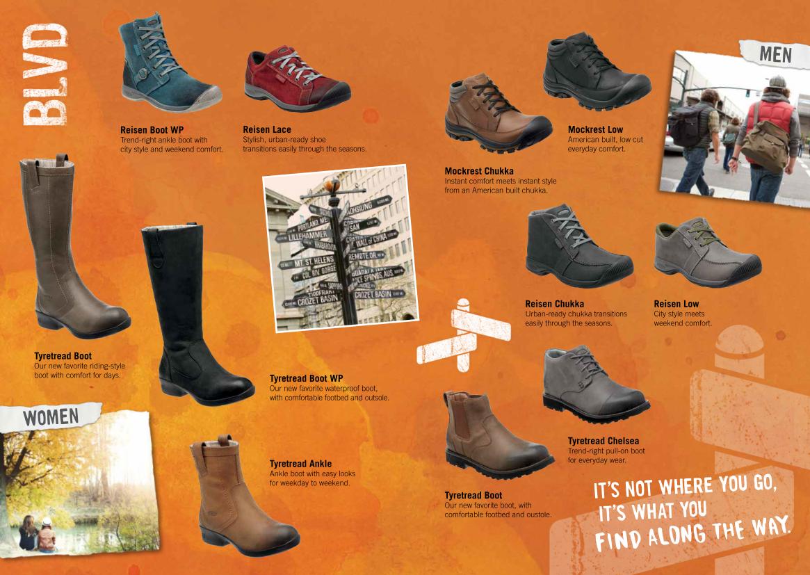 W miejskiej kolekcji Boulevard znalazły się unowocześnione klasyczne modele KEEN, które mają zapewnić nie tylko komfort, ale także dać wyraz luksusowemu, przyciągającemu wzrok stylowi. I tak powstała modna, przejściowa, miejska linia sznurowanych butówReisen, wzbogaconycho inspirowane europejską stylistyką połyskujące detale. Reisen Lace, ReisenBoot WP dla kobiet oraz ReisenLow i ReisenChukka dla me?z?czyznsa? wykonane z licowej skóry i mają elegancko wykończone szwy. LiniaTyretread, to skórzane modele na co dzień i na weekend z delikatna? meshowa? wys?ciółka?, utrzymuja?cą właściwą amortyzacje? stopy. Wysoki damski TyretreadBootzaprojektowany został specjalnie dla kobiet pragna?cych modnych butów do aktywności przez cały dzien? i zabawy cała? noc.Wszechstronne, stylowe TyretreadAnkle to wielki must-have dla osób które wola? niz?sza? wersje? tego typu, za to me?skieTyretread Chelsea i TyretreadBoot będą idealnym rozwiązaniem na co dzień dla mężczyzn ceniących sobie modny klasycznylook. LinięWapatostworzono z mys?la? o fashionistkachpotrzebuja?cych ciepłego buta, który be?dzieprzycia?gał wzrok zabawnym i stylowym zimowymlookiem.