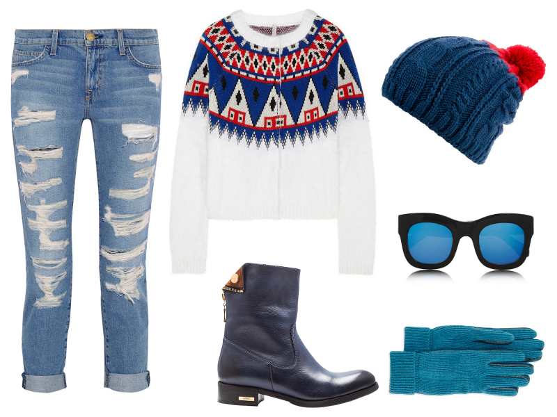 Kulig z ogniskiem i pieczeniem kiełbasek czy biesiada w szałasie to obowiązkowe atrakcje zimowego wypoczynku w górach. Pamiętajmy wtedy o ubraniu się na cebulkę. Proponujemy kolorowy kardigan, do którego świetnie pasują poszarpane dżinsy. W tym sezonie modne są wyraziste zamki, suwaki i złote akcesoria, dlatego stylizację świetnie ożywią granatowe botki z odwijaną brązową cholewką i ozdobnym zamkiem z tyłu, rozświetlone złotymi metalowymi dodatkami. Do tego ciepła granatowa czapka z kontrastowym czerwonym pomponem, niebieskie rękawiczki i jesteśmy gotowe na białe szaleństwa!
