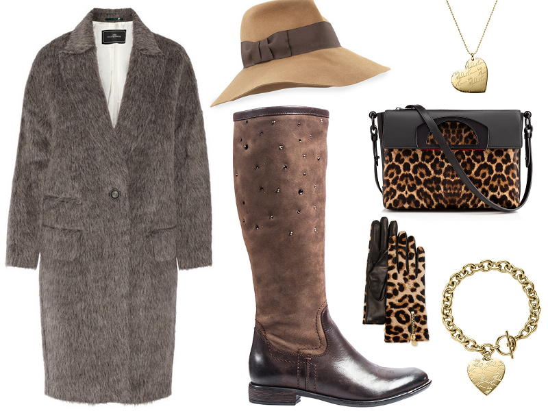 Stylizacja 8: wełniany płaszcz Malene Birger, brązowe kozaki Carinii z zamszową cholewką zdobioną kryształkami Swarovskiego, torebka z lamparcim printem Christian Louboutin, kapelusz Eric Javits, rękawiczki w lamparcie cętki Diane von Furstenberg, naszyjnik i bransoletka Michael Kors