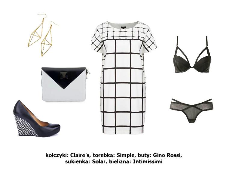 Geometryczneprintywyglądają równie dobrze w wydaniu black&white. Klasyczne zestawienie kolorystyczne w połączeniu z trapezowym fasonem sukienki inspirowanym modą lat 60. tworzy elegancką i szykowną całość. Do tak wyrazistej bazy wystarczy dobrać minimalistyczne dodatki.