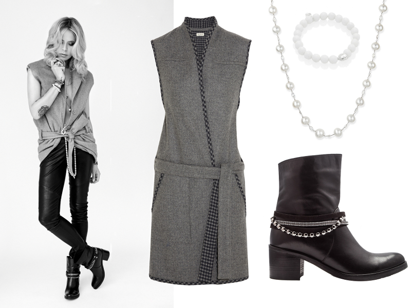 Stylizacja 1: we??niana kamizelka Suno, botki Carinii na obcasie z rockowymi paskami zdobionymi nitami, naszyjnik Belpearl, bransoletka Mokobelle z bia??ymi jadeitami.
