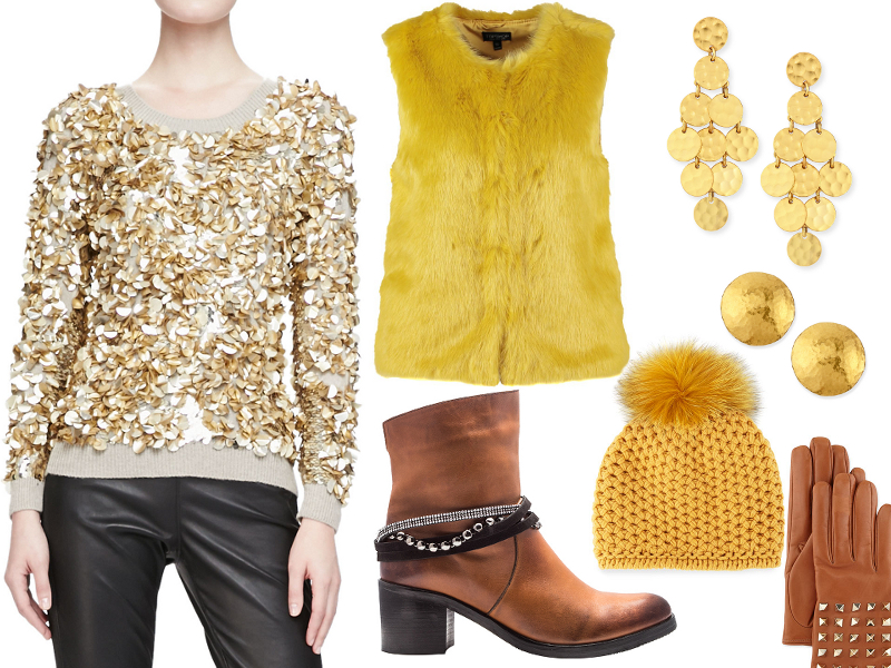 Stylizacja 2. Kamizelka futrzana Topshop, brązowe botki Carinii, cekinowy sweter i skórzane spodnie Burberry London, rękawiczki zdobione ćwiekami Valentino, czapka Inverni, kolczyki Stephanie Kantis.